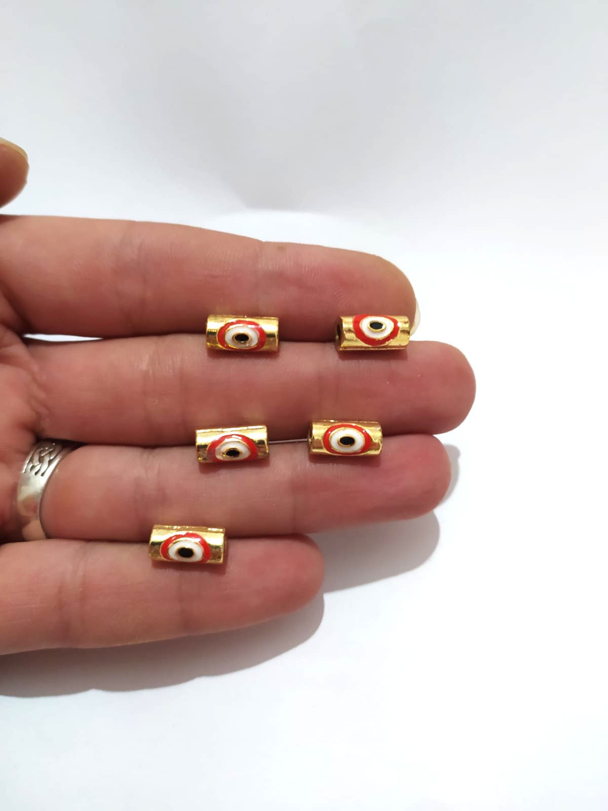 Takı Yapımı için 5 Adet Gold Kırmızı Silindir Nazar Boncuk Şans Kolye Bileklik Halhal Ucu
